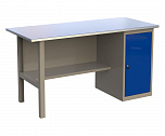 Однотумбовый. Допустимая нагрузка на столешницу 750 кг. Опорные элементы выполнены сварными из холоднокатаной стали. Верстак состоит из  опоры, тумбы P7 с дверью и двумя полками и полки-стенки. Все металлические элементы покрыты полиэфирной порошковой краской. Столешница состоит из фанеры марки ФСФ толщиной 24 мм, которая покрыта лаком-антисептиком и листом оцинкованной холоднокатаной стали толщиной 1,2 мм. Размеры (ВхШхГ) 855x1196x696 мм.