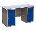 Двухтумбовый. Допустимая нагрузка на столешницу 1000 кг. Опорные элементы выполнены сварными из холоднокатаной стали. Для выполнения сборочных, ремонтных, слесарных, монтажных и других видов работ на производстве, в сервисных центрах, мастерских, гаражах, а также для обучения технологии в учебных заведениях. Комплектуется полкой-стенкой, расположенной под столешницей для удобного размещения габаритного инструмента и оснастки. Размеры верстака: 855x1596x696 мм. Вес: 121 кг. Поставляется в 4 комплектациях на выбор.