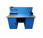 Двухтумбовый. Допустимая нагрузка на столешницу 1000 кг. Опорные элементы выполнены сварными из холоднокатаной стали. Для выполнения сборочных, ремонтных, слесарных, монтажных и других видов работ на производстве, в сервисных центрах, мастерских, гаражах, а также для обучения технологии в учебных заведениях. Комплектуется полкой-стенкой, расположенной под столешницей для удобного размещения габаритного инструмента и оснастки. Размеры верстака: 855x1596x696 мм. Вес: 122 кг. Поставляется в 4 комплектациях на выбор.