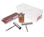 В наборе присутствует: Шило с Т-образной ручкой со сменным наконечником Длина наконечника: 53 мм. Прочная металлическая ручка. Изготовлена из хром-молибденового сплава. Шило для ремонта автошин 72мм с металлической ручкой и сменной насадкой. Изготовлена из хром-молибденового сплава. Рабочая длина: 72 мм. Полоски вулканизационных жгутов подходят для всех автомобильных покрышек. В упаковке: 25 жгутов по 5 шт. Клей-герметик. Переносный кейс для хранения инструментов