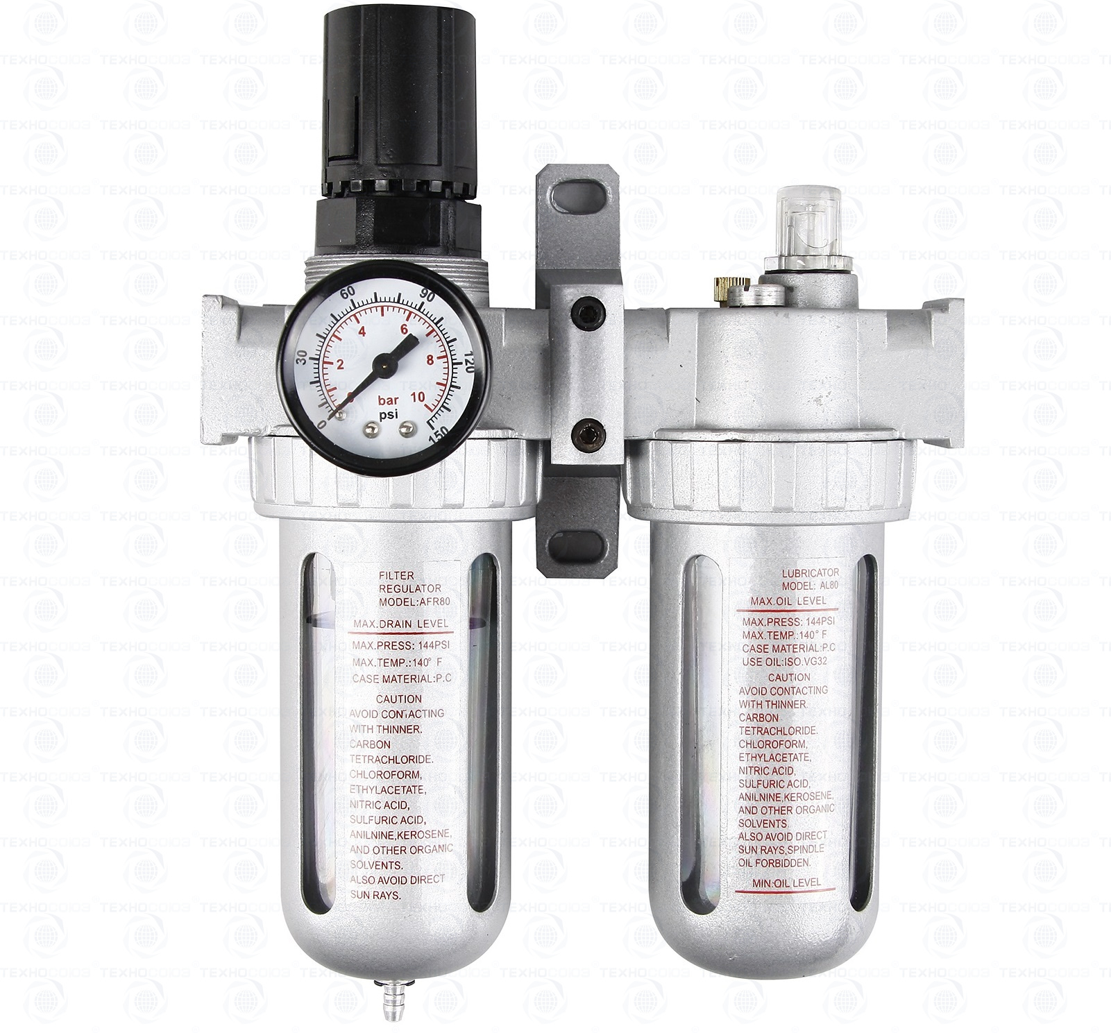 Регулятор давления воздуха с лубрикатором, влагоотделителем и манометром. Для подключения одного или нескольких пневмоинструментов – 2000 л/мин. Снижает давление между компрессором и пневмоинструментом. Регулятор давления воздуха с лубрикатором, влагоотделителем и манометром вход/выход - ½”. Давление компрессора 8÷10Бар.