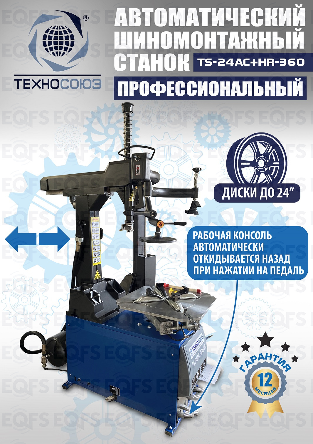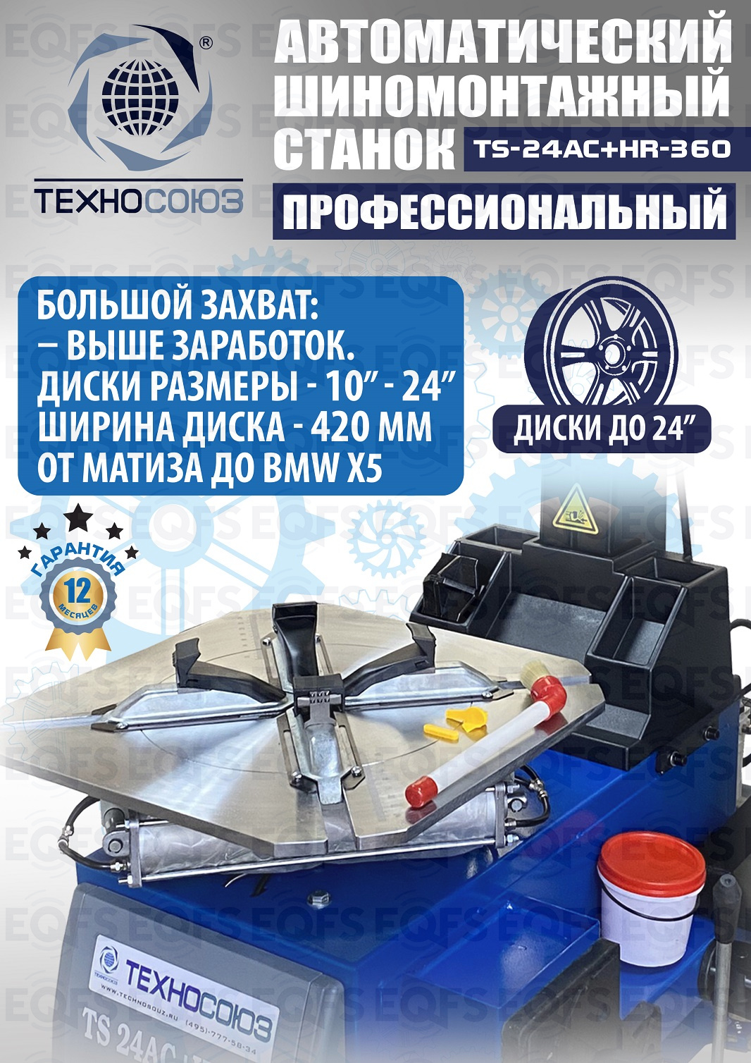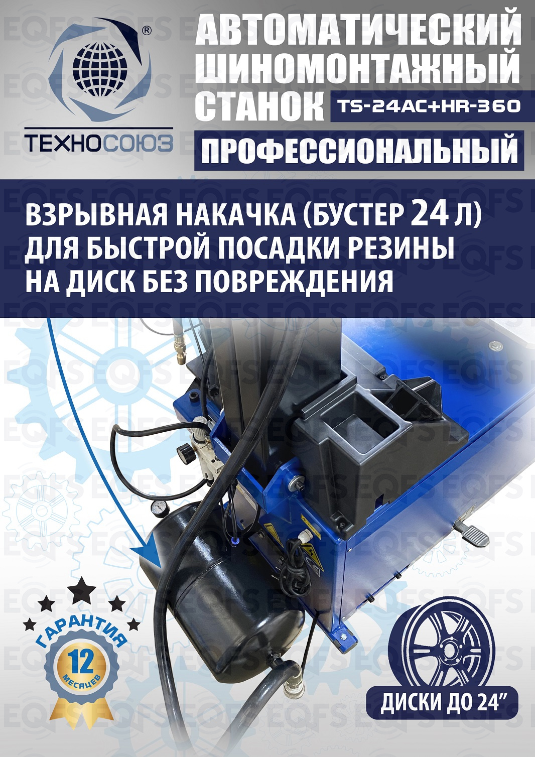 Автоматического шиномонтажного стенда TS-24AC+HR-360. В комплекте взрывная подкачка + третья рука для работы с низкопрофильными шинами и RanFlat! Для колес легковых автомобилей, легких грузовиков, микроавтобусов и коммерческой техники. Для дисков: внешний 10÷21”, внутренний 12÷24”. Напряжение 220/380В. Гарантия 18 мес. – наш монтаж, 12 мес. – самостоятельная установка.