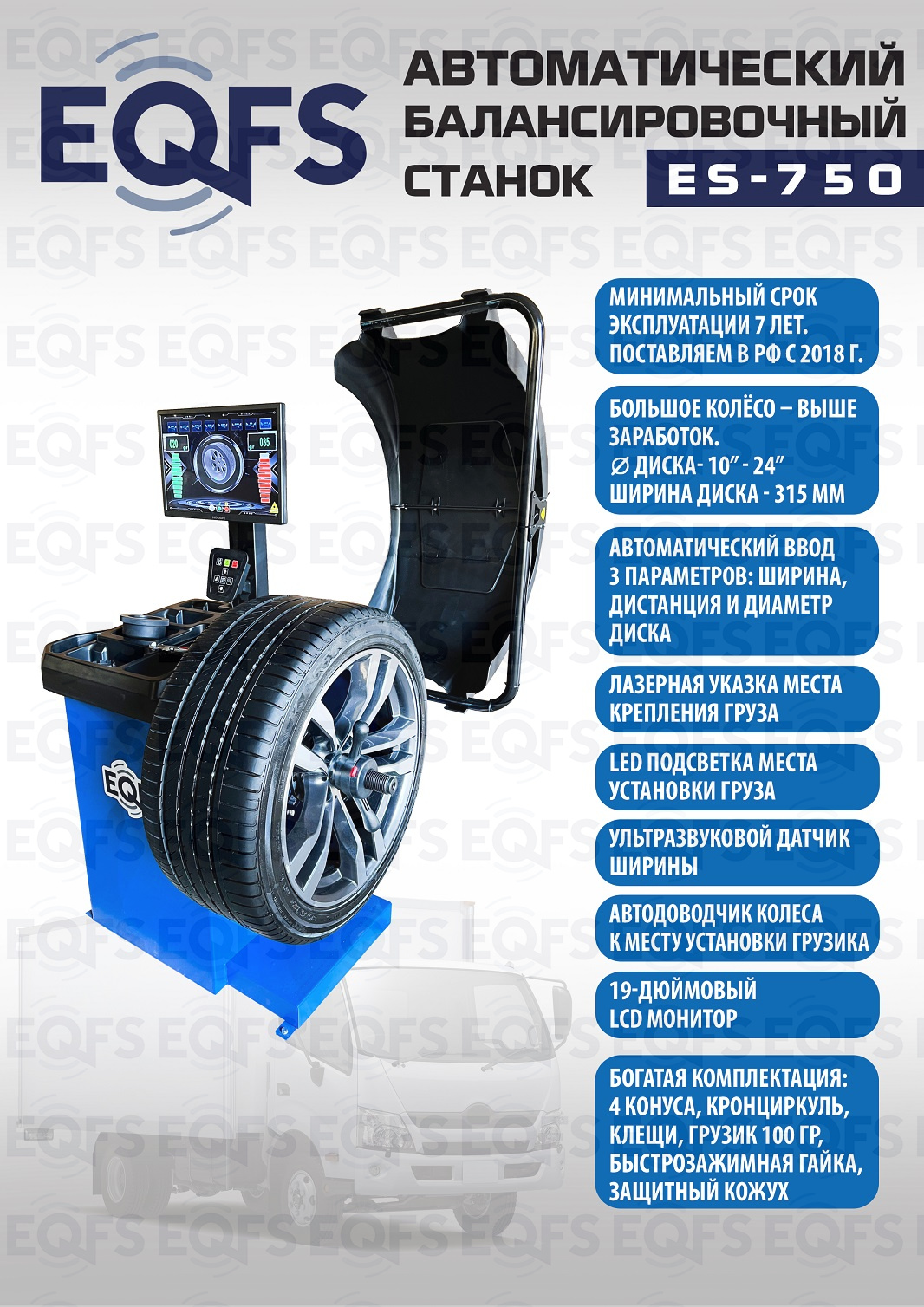 ES-750 Балансировочный станок. Автомат. Для широких колес 315 х R21 от BMW, MB, RANGE ROVER и т.д. Ввод 3-х параметров ( диаметра диска, дистанции и ширины диска), 19-дюймовый LCD монитор с высококачественной 3D-графикой, ультразвуковой датчик ширины. Автодоводчик и лазерная указка места установки грузика. Автоматический ввод 3-х параметров. Для колёс шириной 315мм, Ø до 800мм и весом до 65кг. Программы: статическая и динамическая балансировка, ALU, OPT, SPLIT, калибровка и самодиагностика. LCD монитор 19 дюймов. Вал Ø - 40мм. Для балансировки колёс легковых автомобилей, мотоциклов, лёгких грузовиков и широких колёс. Гарантия 18 мес – наш монтаж, 12 мес – самостоятельная установка.