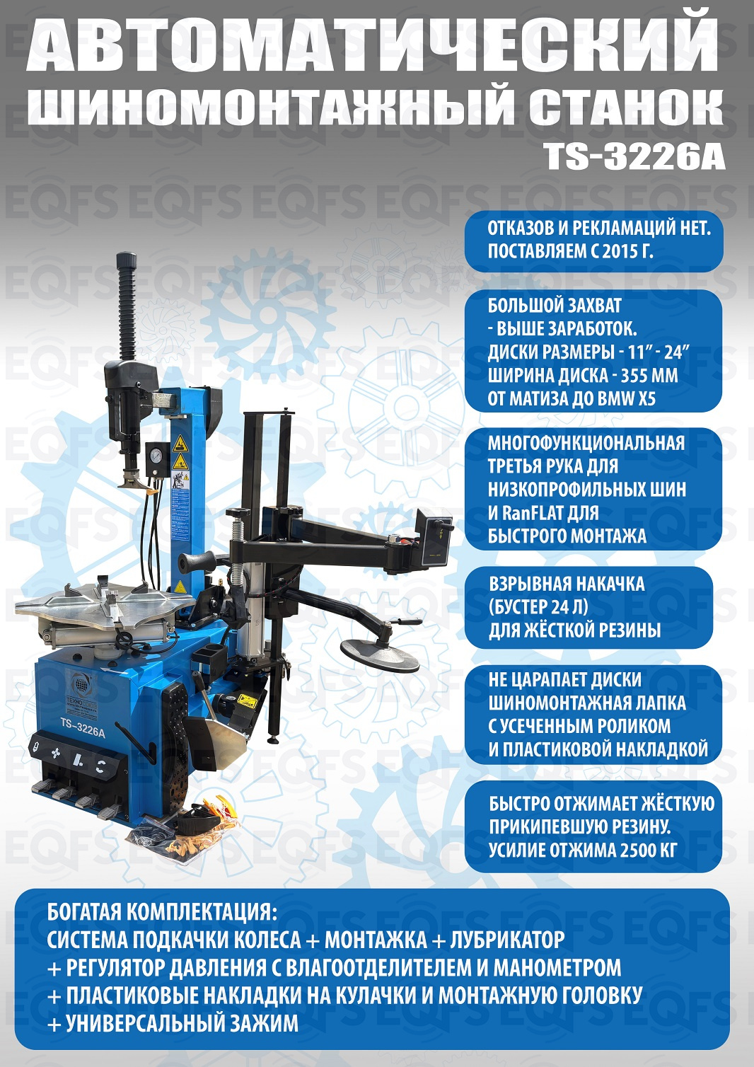 Автоматического шиномонтажного станка TS-3226А предназначен для монтажа и демонтажа колес легковых автомобилей, легких грузовиков, не больших автобусов и коммерческой техники. Для дисков: 11÷24”. В комплекте: полноценная 3-я рука для работы с жесткой и низкопрофильной резиной RUNFLAT. + встроенный бустер  24 литра (взрывная подкачка) + пистолет для подкачки шин + монтажка + регулятор давления с влагоотделителем и манометром.