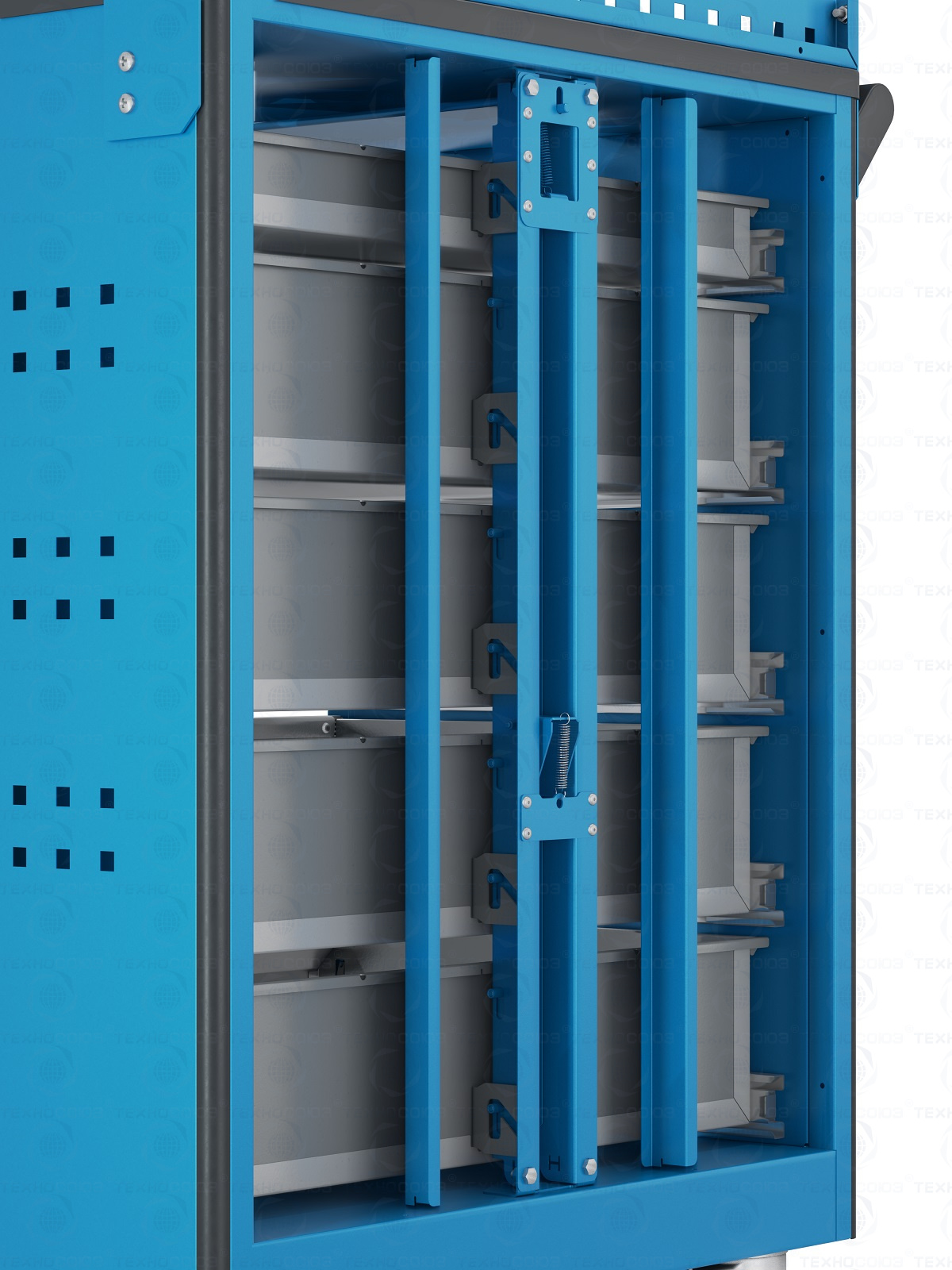 Каждый ящик снабжен клавишной системой антиоткрывания из оцинкованной стали, препятствующей самопроизвольному выдвижению ящиков, например, при наклоне или перемещении тележки.