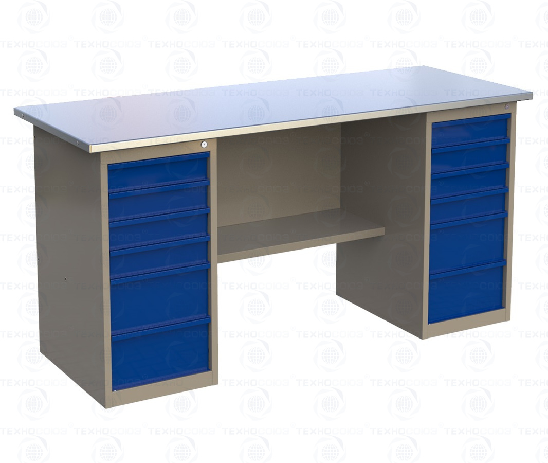 Верстак двухтумбовый 1800 ML6/ML6 поставляется в разобранном виде (4 элемента). Нагрузка на столешницу до 600 кг. Стандартный цвет: корпус - серый глянец RAL 7030, ящики и двери тумб - синий RAL 5017. Размеры:855x1800x700 мм. Масса: 127 кг.